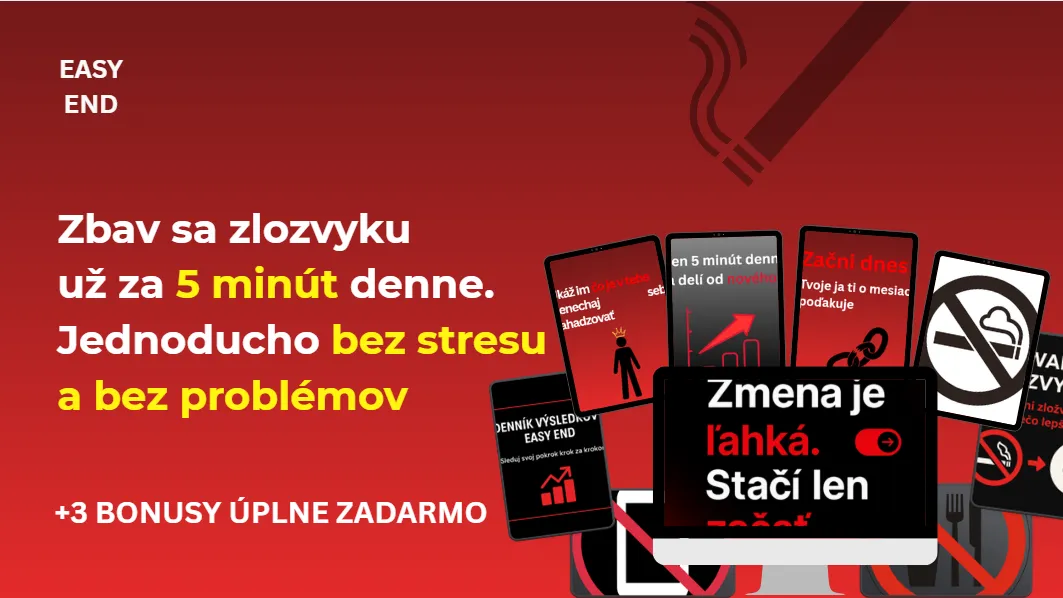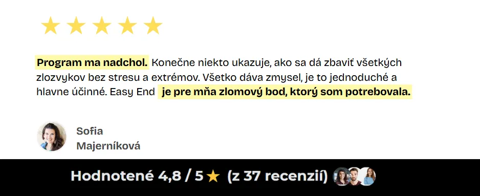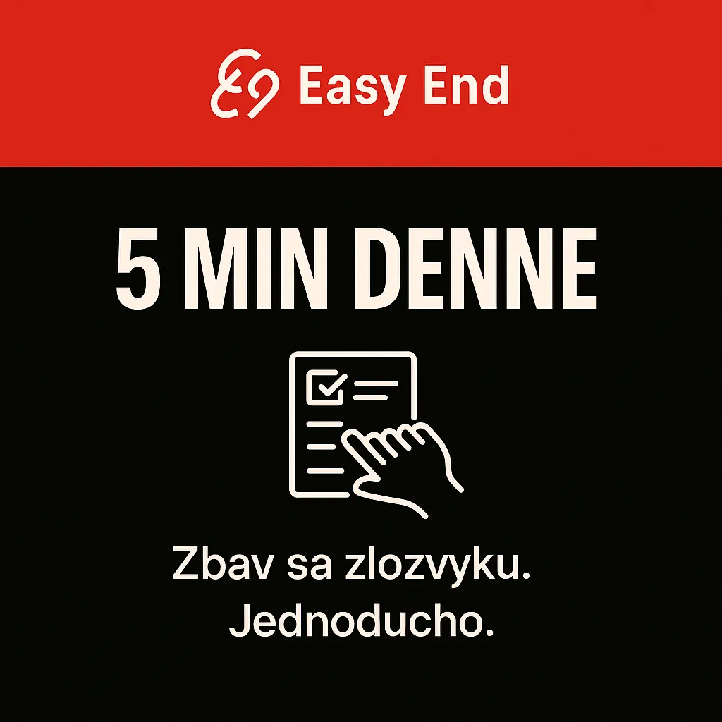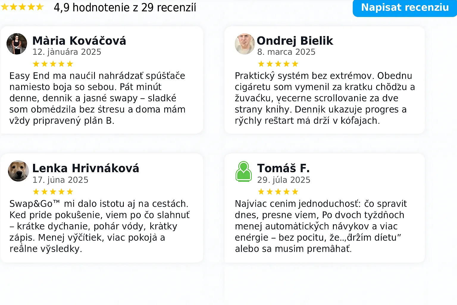 Easy End mi zmenil život spôsobom, ktorý som nečakala. Nepotrebovala som železnú disciplínu – stačilo 5 minút denne a metodika Swap&Go™. Pochopila som svoje spúšťače: ráno ich vymením za krátke dýchanie, po práci za 10-minútovú chôdzu, večer za čaj a zápis do denníka. Na oslavách či na dovolenke presne viem, čo urobiť, keď príde pokušenie – mám pripravené „swapy“ aj záložný plán. Checklist a denník mi dávajú istotu a keď sa pošmyknem, „rýchly reštart“ ma vráti do rytmu bez výčitiek. Táto sloboda a flexibilita je na nezaplatenie. Už nie som v pasci „môžem/nesmiem“ – mám jasné, jednoduché kroky, ktoré fungujú v reálnom živote. Ďakujem, Easy End – s týmto systémom už nebudem potrebovať ďalší „zázračný“ návod.