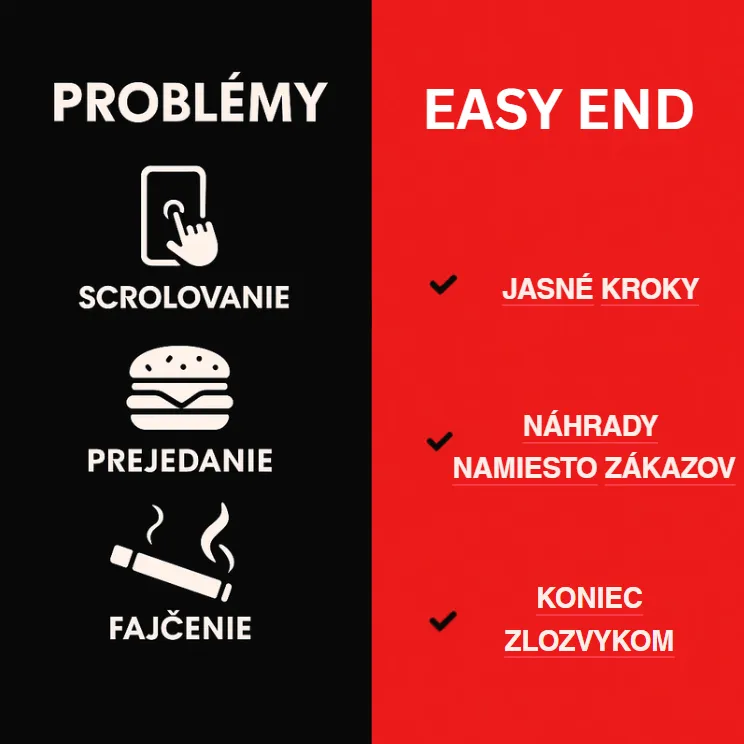 Easy End je jednoduchý plán pre každého, kto chce konečne skoncovať so zlozvykmi a cítiť sa lepšie vo vlastnej koži – bez extrémov, zákazov a zbytočného stresu.