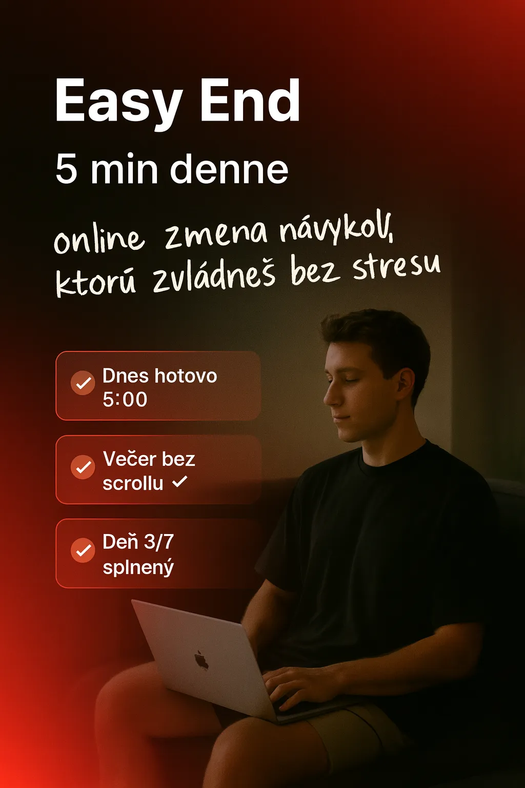 Nebudem sa hrať na hrdinu: Easy End bol prvý plán, pri ktorom som nemusel prevrátiť život naruby. Stačilo 5 minút denne – zmapoval som spúšťače a cez Swap&Go™ som im dal náhrady: po práci krátka prechádzka namiesto telefónu, večer dve strany knihy miesto scrollovania, v aute žuvačka namiesto cigarety. Checklist drží rámec, denník mi ukázal, čo reálne funguje. Na oslavách a na cestách mám pripravené „záložné“ swapy, takže nevypadnem z rytmu. Keď som vynechal pár dní, rýchly reštart a bez drámy som bol späť v koľajach. Výsledok? Menej automatických nutkaní, viac energie a žiadny pocit, že „držím diétu“ či bojujem so sebou. Priamočiary, praktický systém – žiadne dogmy, len malé kroky, ktoré sa dajú udržať. Za mňa funkčné riešenie, nie motivačný plagát.
